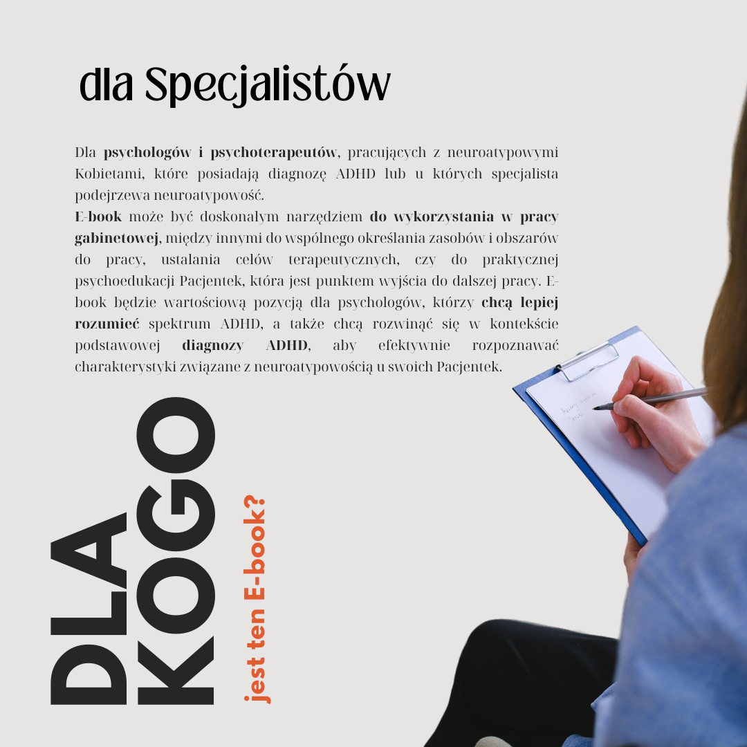 E-book może być doskonałym narzędziem do wykorzystania w pracy gabinetowej, między innymi do wspólnego określania zasobów i obszarów do pracy, ustalania cełów terapeutycznych, czy do praktycznej psychoedukacji Pacjentek, która jest punktem wyjścia do dalszej pracy. E-book będzie wartościową pozycją dla psychologów, którzy chcą lepiej rozumieć spektrum ADHD, a także chcą rozwinąć się w kontekście podstawowej diagnozy ADHD, aby efektywnie rozpoznawać charakterystyki związane z neuroatypowością u swoich Pacjentek.
